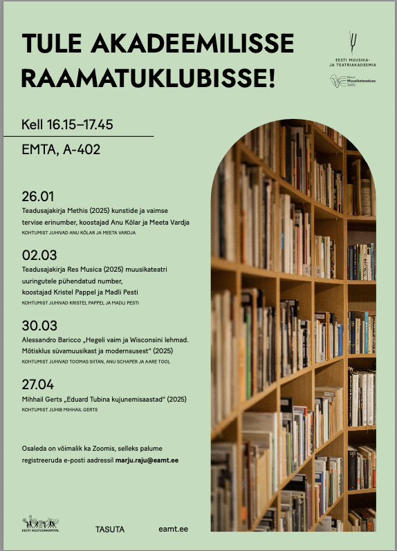 Sellest aastast jätkub 2025. aasta sügisel alguse saanud populaarne Eesti Muusika- ja Teatriakadeemia ja Eesti Muusikateaduse Seltsi raamatuklubi. Mõlemasse poolaastasse on planeeritud neli kohtumist. Igal kohtumisel on fookuses üks akadeemiline teos (originaal- või tõlketeos), mille autorid, toimetajad, koostajad ja tõlkijad on eesti muusikateadlased.